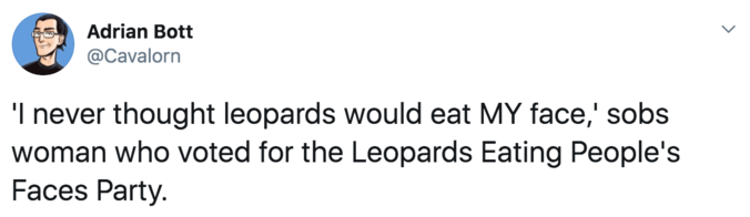 What McKay doesn’t seem to get is that we are years into screaming into the abyss. We know people are willfully ignorant. We know people don’t give a fuck until a social issue bites them in the ass. We have read countless articles about people directly harmed by Trump’s policies who didn’t realize that Trump’s policies would ever harm them (and the policies are totes okay if they harm other people, preferably people with darker skin). For a while, there were stories of immigrants tossed out of the country without any notice whose family members had voted for Trump, thinking that it would only be those OTHER immigrants who would get kicked out. We heard about the farmers who suffered as a result of Trump’s economic policies who thought that Trump would suddenly start caring about them on January 20, 2017 (since he definitely didn’t care about them beforehand). Remember the woman who voted for the Leopards Eating Faces Party who sobbed after leopards ate HER face?